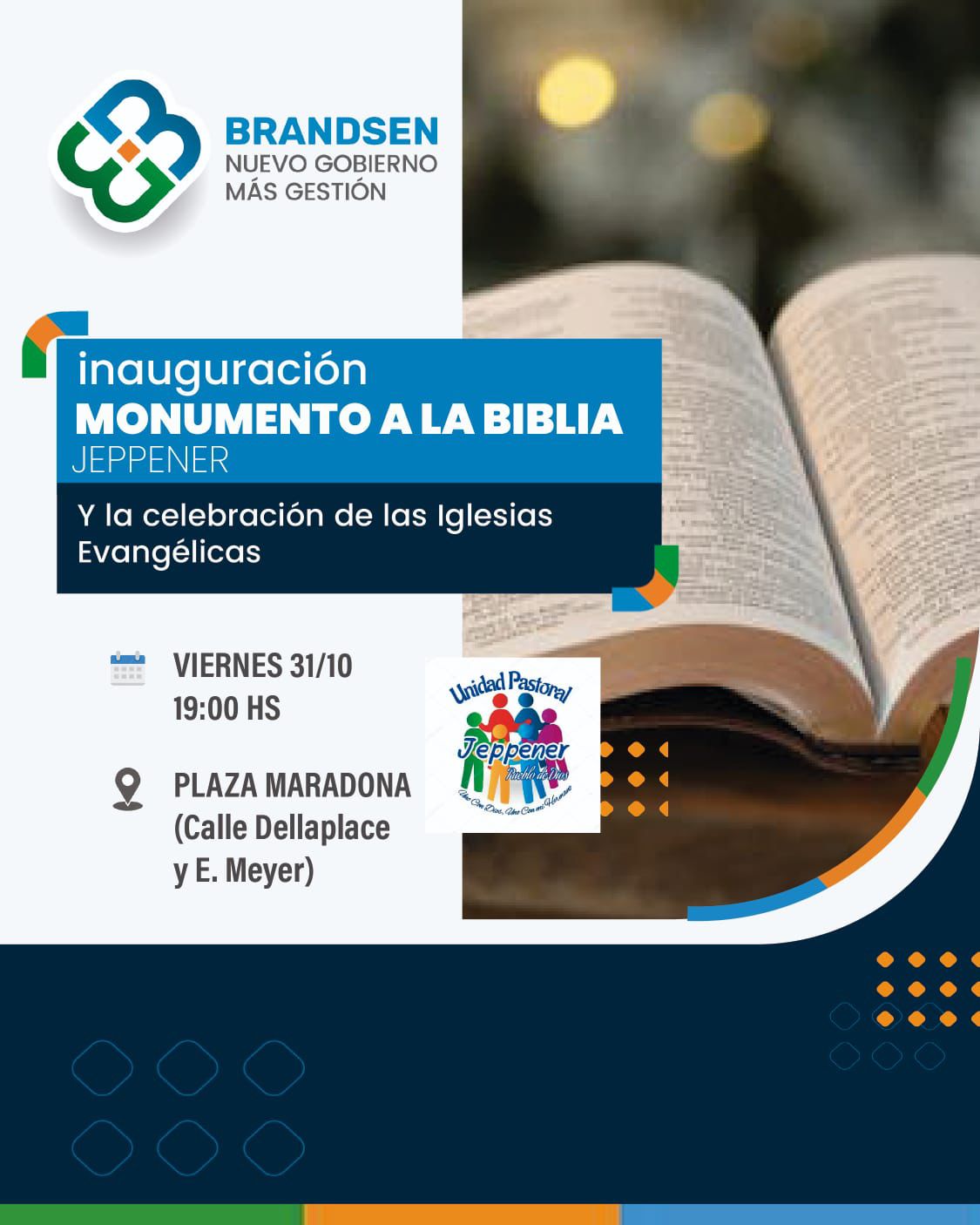 La comunidad de Jeppener se prepara para vivir un encuentro especial de fe y unidad. Este viernes 31 de octubre, a las 19 horas, se realizará en la Plaza Maradona (ubicada en las calles Dellaplace y E. Meyer) la inauguración del Monumento a la Biblia, en el marco de la Jornada de las Iglesias Evangélicas.