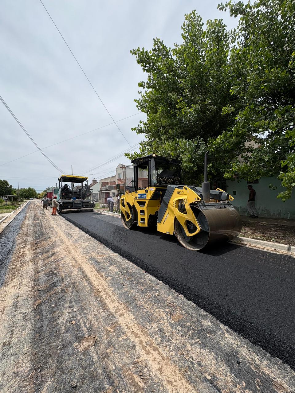 La Municipalidad de Brandsen avanza con el asfaltado de calle French, donde se ejecuta la colocación de la carpeta asfáltica y su correspondiente compactación, con maquinaria vial y personal trabajando en el lugar.